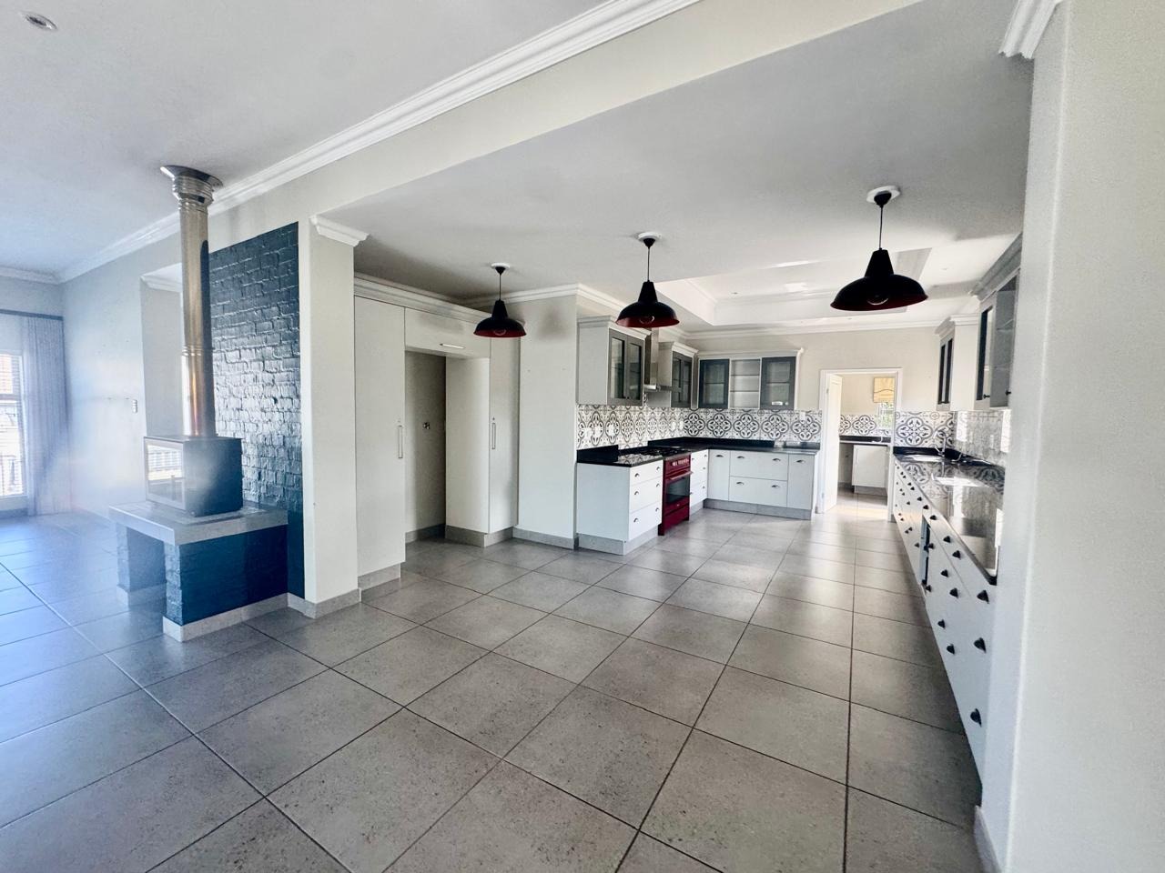 The kitchen itself is a standout, fitted with ample cabinetry, quality finishes, and centered around a striking red SMEG gas stove with electric oven that adds both function and flair. The adjacent scullery is well equipped, offering additional cupboards and appliance space, and leads out to a large, enclosed courtyard. Here, you can easily imagine a vibrant outdoor living area with a generous dining table beneath a garden umbrella, potted blooms, herbs, and vegetables in the raised beds, a private and tranquil retreat.