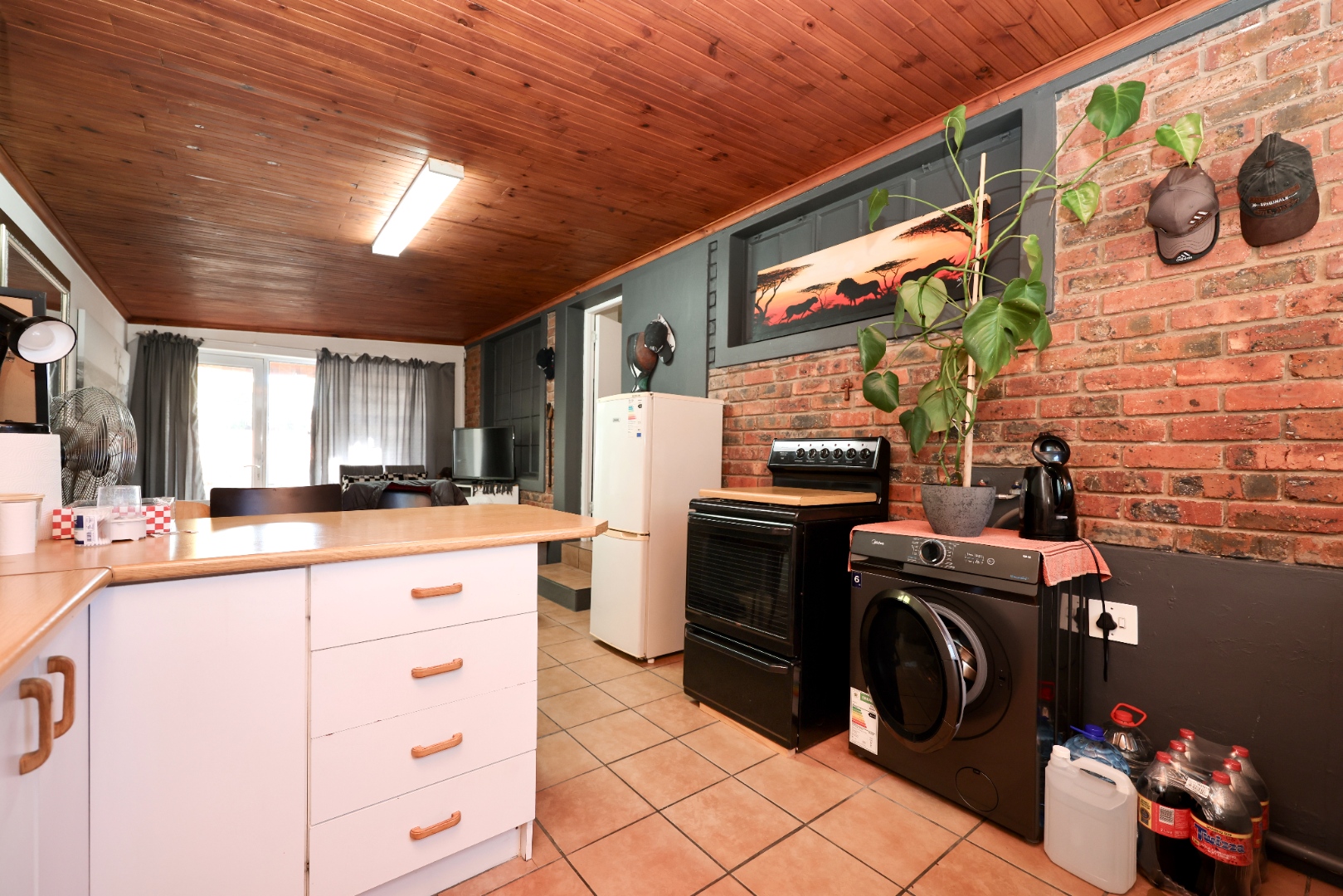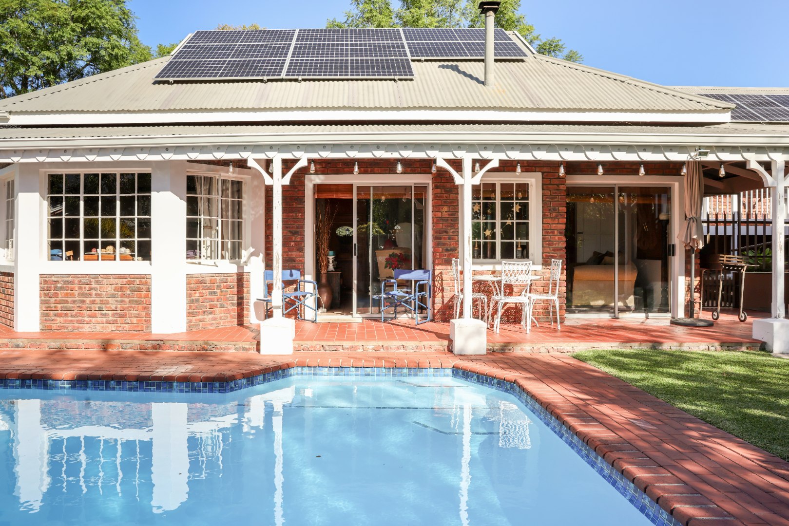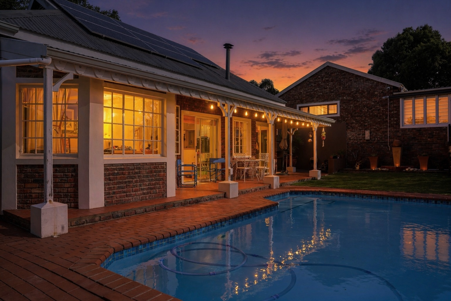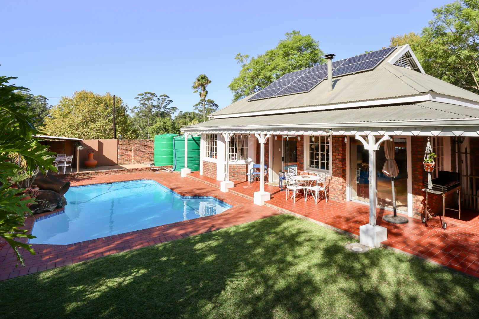 The exterior is designed for low maintenance, with mostly paved areas complemented by a small garden and outdoor braai space. Additional features include two 5000L water tanks for rainwater harvesting, for the swimming pool, as well as 2x5000l tanks for fresh borehole water, energy-efficient systems with two 5kW inverters, backup batteries, and 18 solar panels.