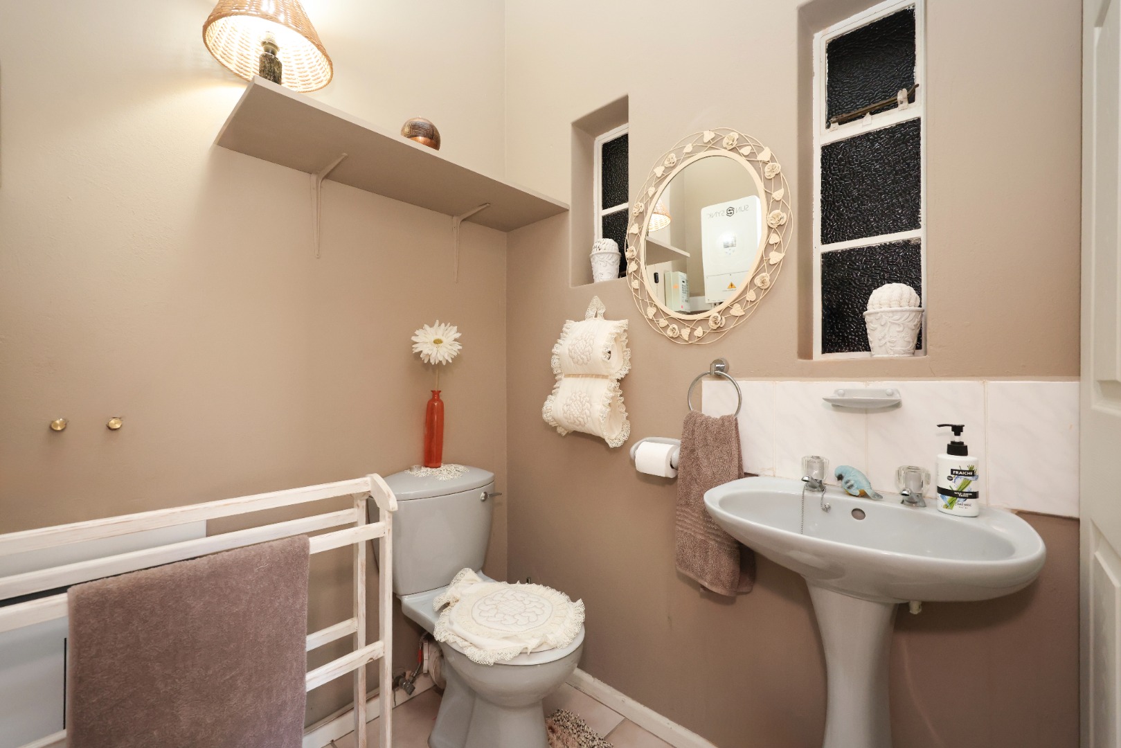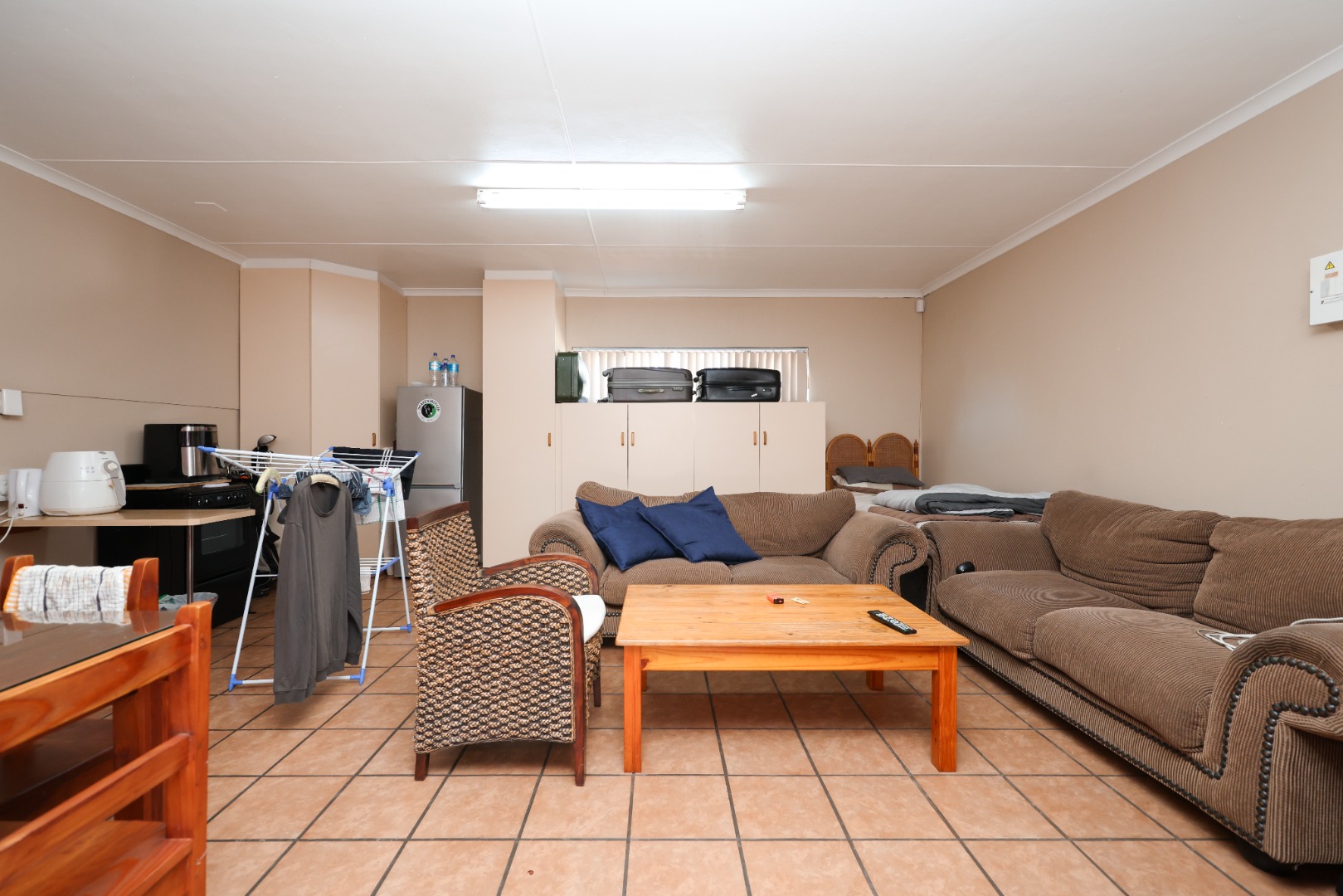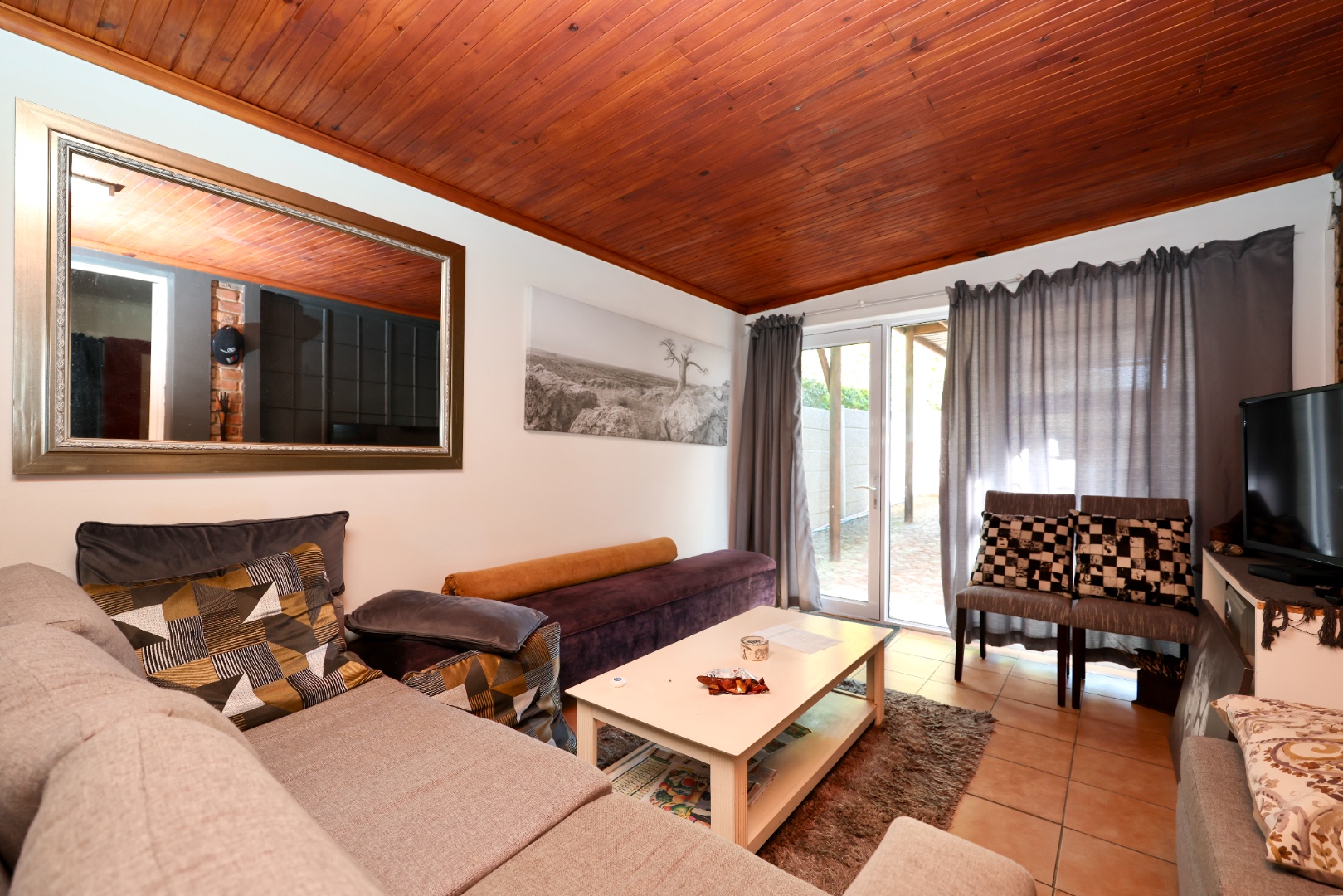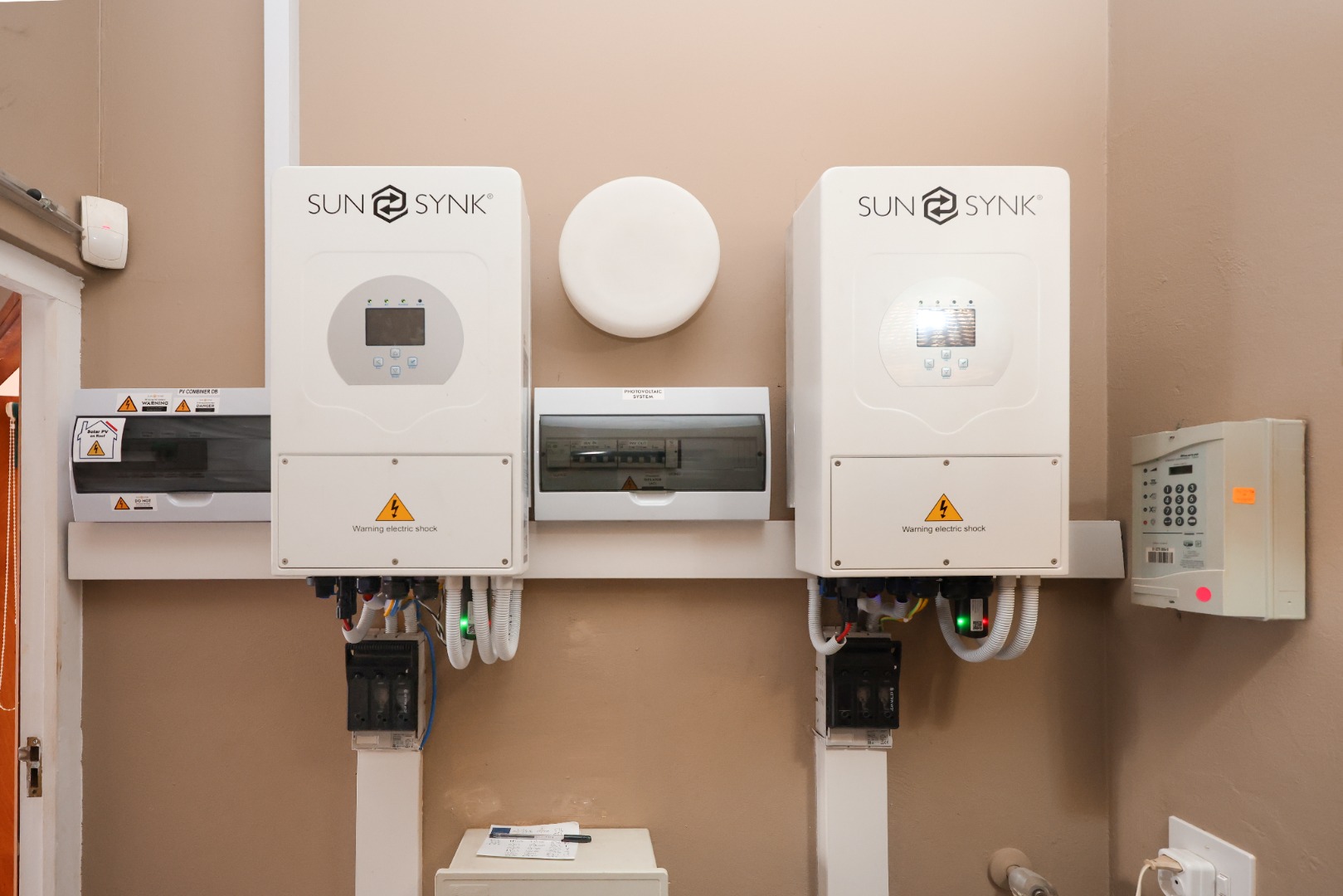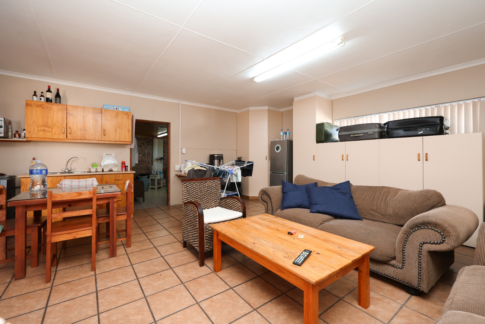 The exterior is designed for low maintenance, with mostly paved areas complemented by a small garden and outdoor braai space. Additional features include two 5000L water tanks for rainwater harvesting, for the swimming pool, as well as 2x5000l tanks for fresh borehole water, energy-efficient systems with two 5kW inverters, backup batteries, and 18 solar panels.