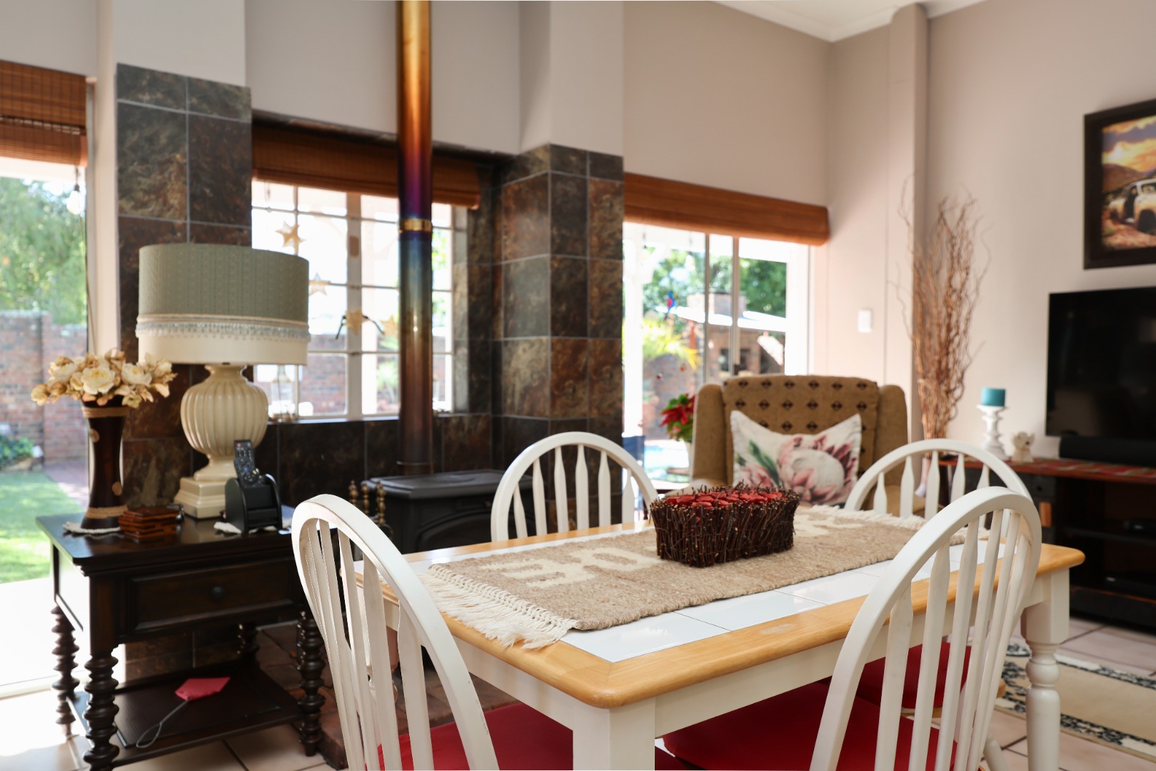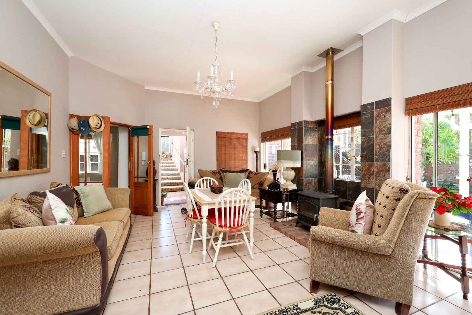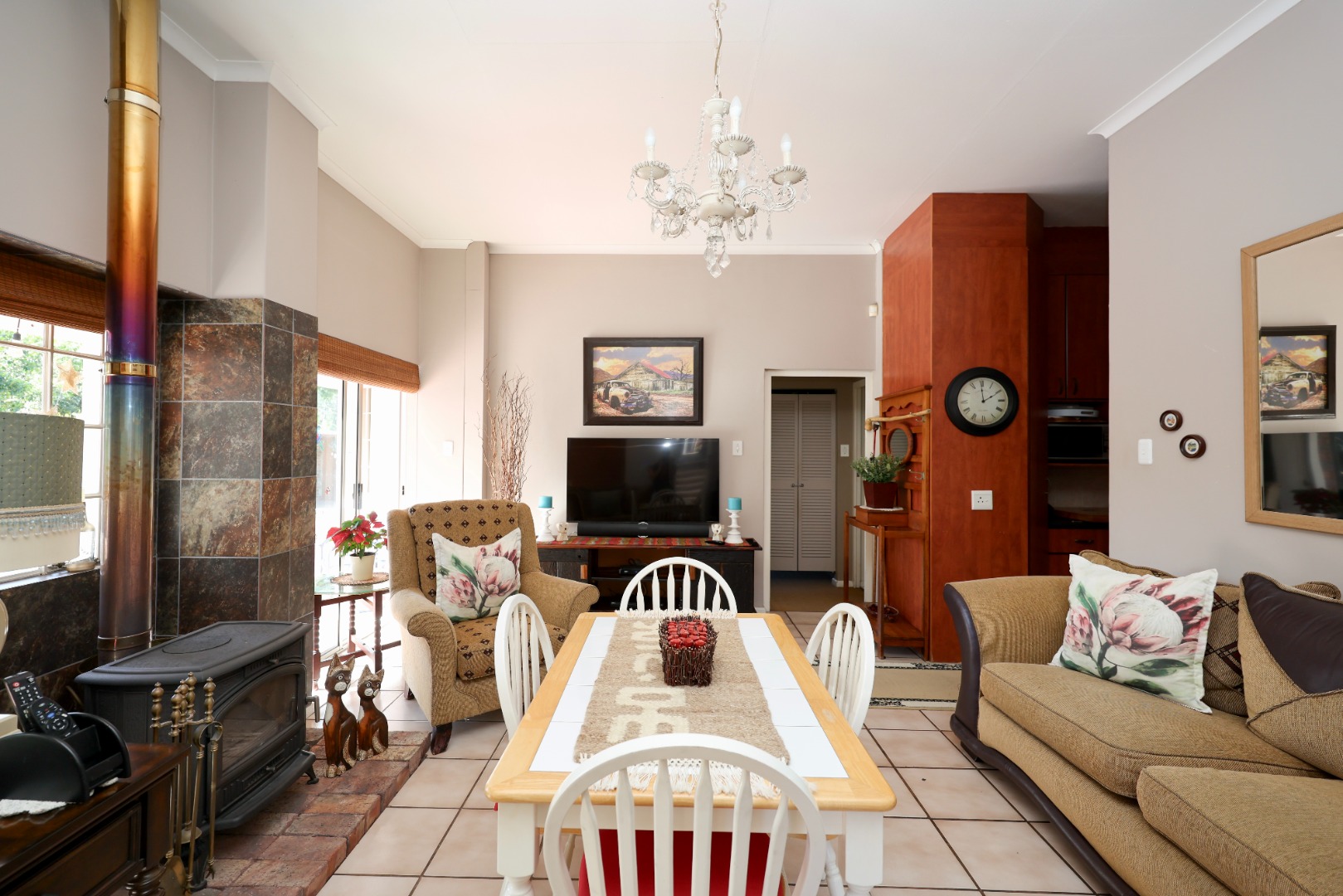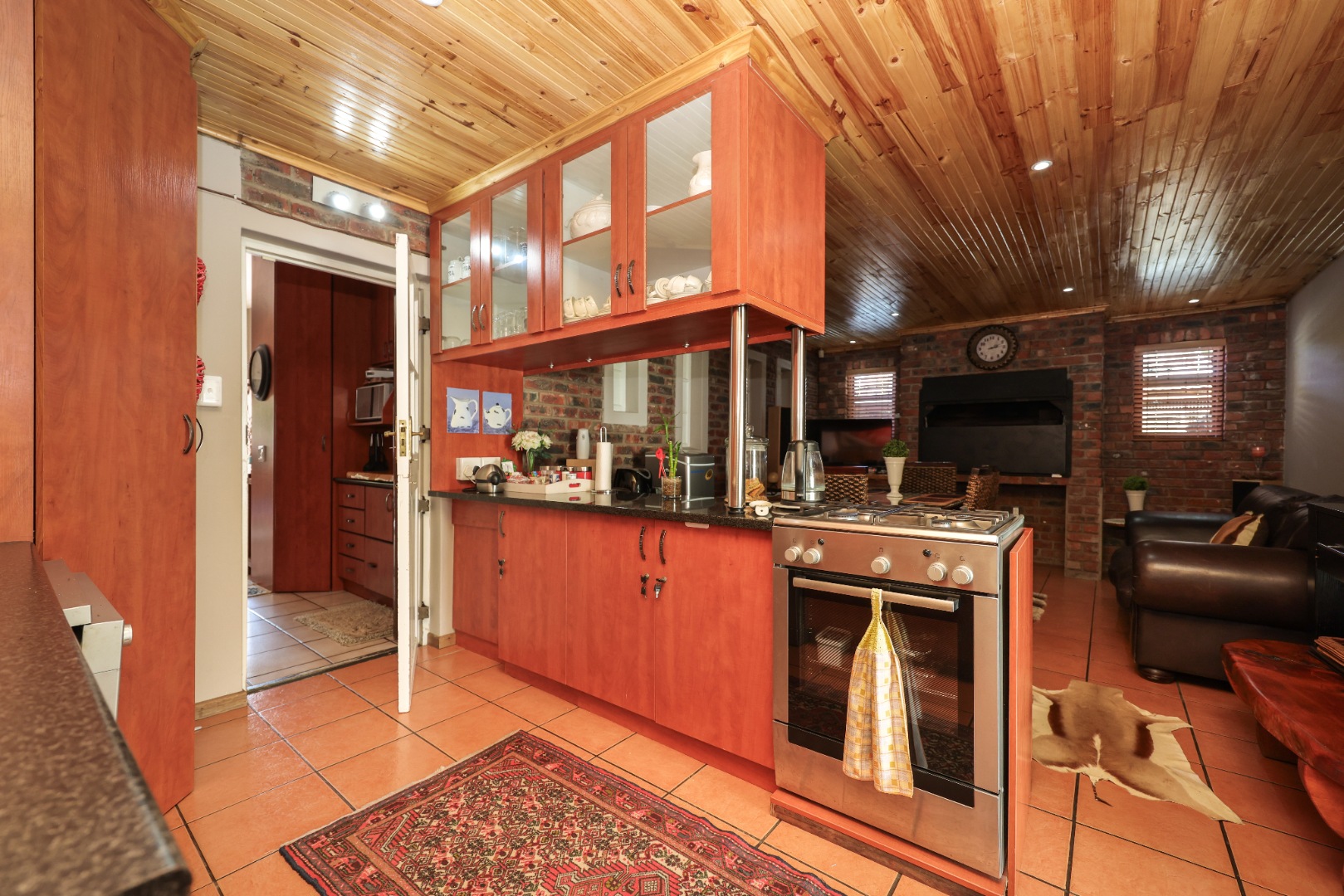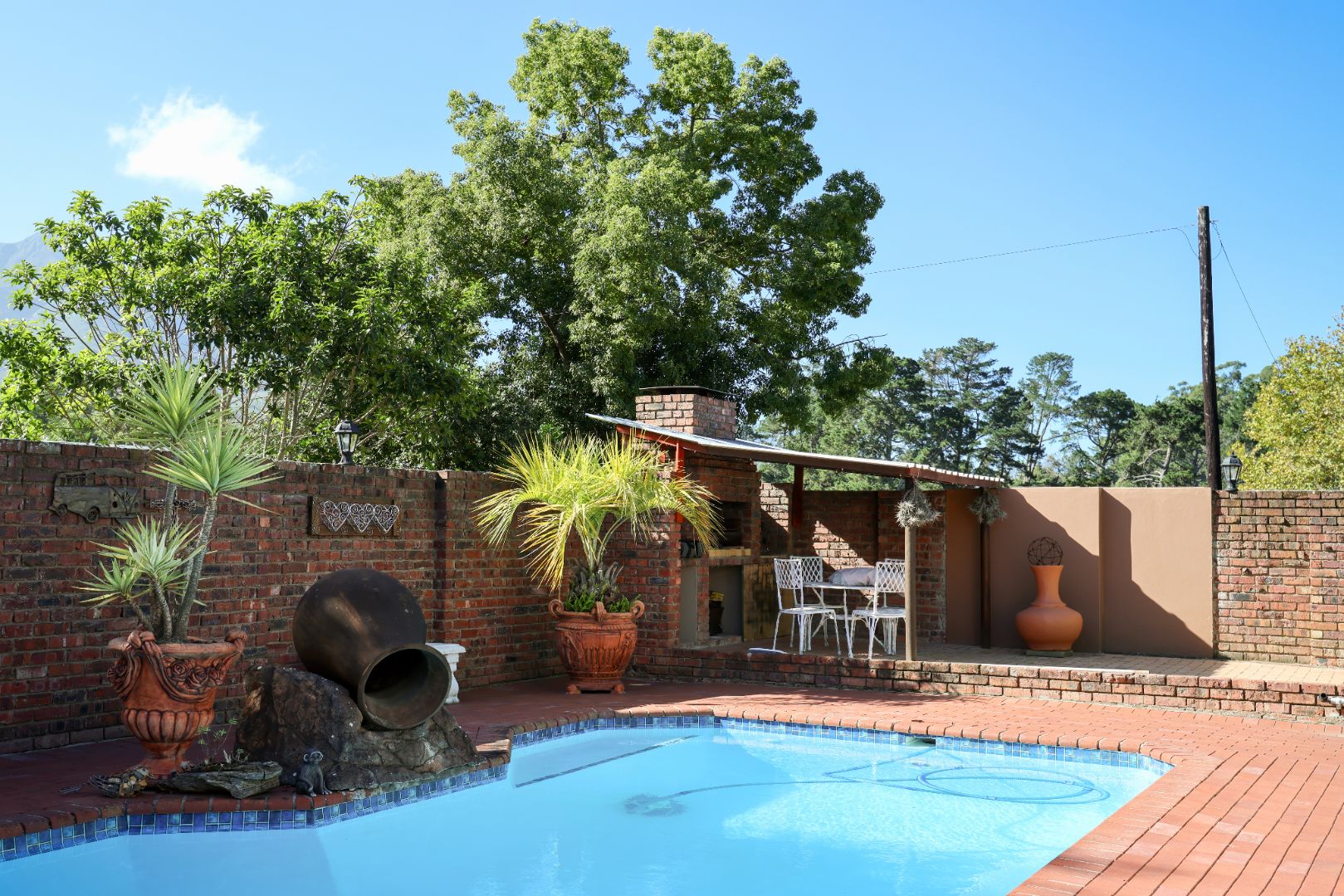 The main residence features three bedrooms and three bathrooms, including a main en-suite. This home has an indoor braai room that flows onto a covered patio overlooking a swimming pool. A separate lounge with a cozy indoor fireplace adds warmth and charm, while the well-appointed kitchen offers granite countertops, a gas stove, and a separate scullery.
