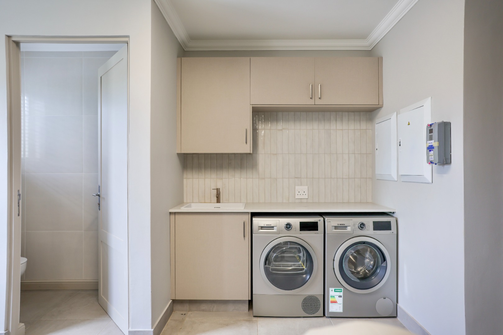 Shared and outdoor features further elevate the home’s appeal and include three garages with four automated doors (one offering direct access to the service yard), built-in-cupboards, an additional toilet with basin, and a dedicated laundry with a sink and space for two appliances. A corridor linking the garage to both living spaces is lined with built-in cupboards, providing generous additional storage. The property boasts a substantial off-grid system with three 4.8 kVA inverters and 30 north-facing solar panels, a dedicated utility room housing five 2 500L water tanks with an automated irrigation pump system, an integrated heat-pump geyser for extremely low electricity consumption, a separate garden tool storage area, a 290m² paved driveway, and approximately 300m² of professionally landscaped garden with automated irrigation.