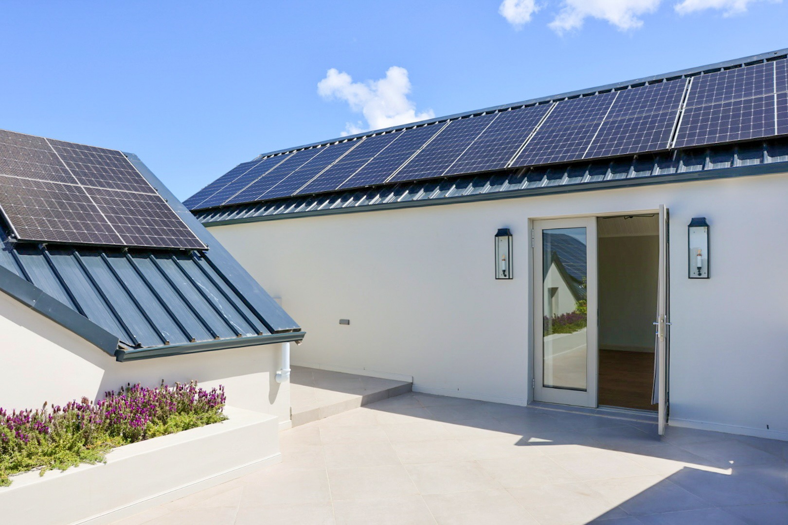 Shared and outdoor features further elevate the home’s appeal and include three garages with four automated doors (one offering direct access to the service yard), built-in-cupboards, an additional toilet with basin, and a dedicated laundry with a sink and space for two appliances. A corridor linking the garage to both living spaces is lined with built-in cupboards, providing generous additional storage. The property boasts a substantial off-grid system with three 4.8 kVA inverters and 30 north-facing solar panels, a dedicated utility room housing five 2 500L water tanks with an automated irrigation pump system, an integrated heat-pump geyser for extremely low electricity consumption, a separate garden tool storage area, a 290m² paved driveway, and approximately 300m² of professionally landscaped garden with automated irrigation.