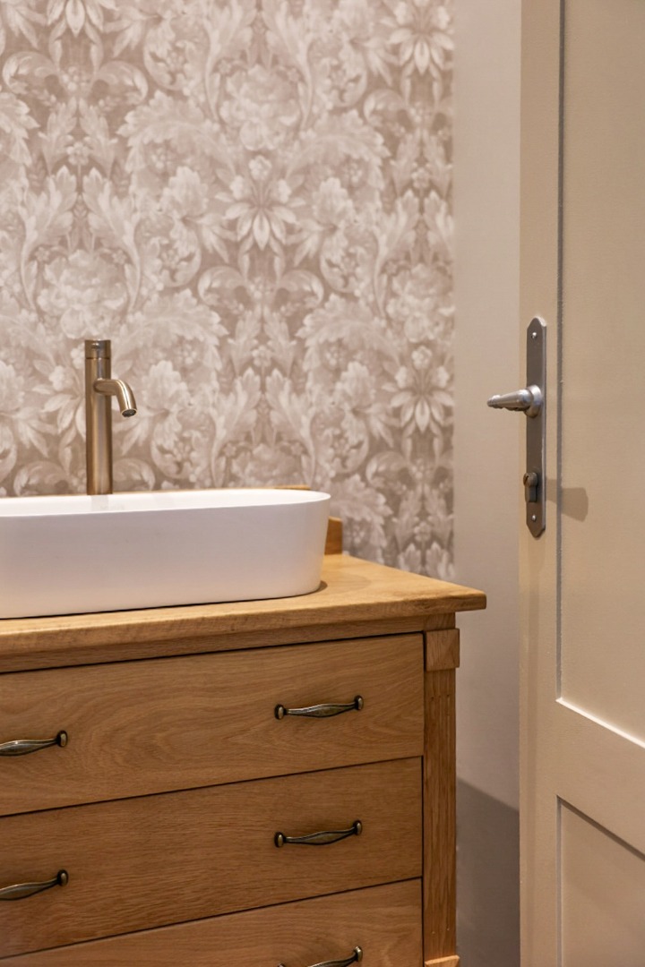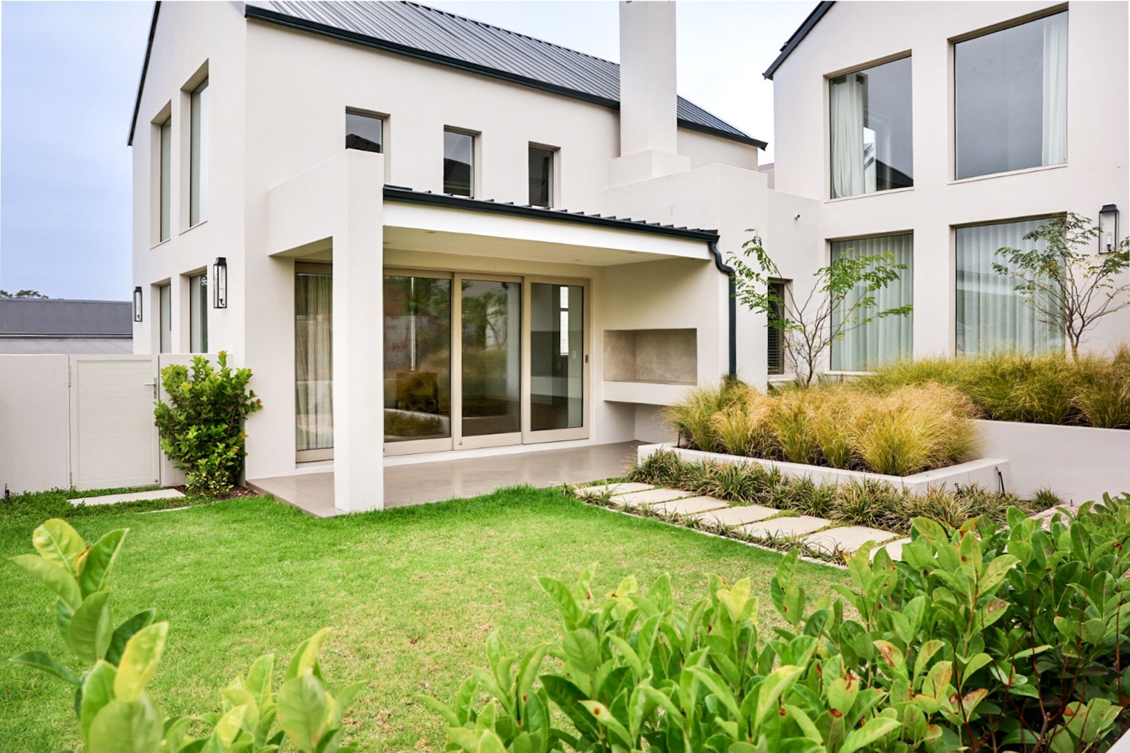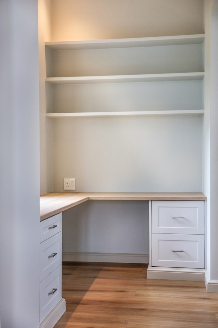 The main house offers two generous en-suite bedrooms (one featuring a full bathroom with both a bath and shower, and the other only a shower) — along with extensive built-in wardrobes with drawers, a separate linen cupboard and a dedicated guest toilet. The main kitchen is stylishly finished with Caesarstone countertops, ample cabinetry and under-counter space for a dishwasher. Included is a double-door fridge/freezer which is, together with the butler sink, fitted with a tri-osmosis water filter system. A separate scullery provides concealed space for a washing machine and tumble dryer and boasts a beautiful double butler sink. The living area impresses with a striking cathedral ceiling, wood-burning combustion fireplace and flows effortlessly onto a north-facing veranda with a gas braai. A built-in study nook with shelving and cupboards, positioned by a window that overlooks the garden, offers a peaceful workspace. Subtle wallpaper accents, air-conditioning in every space, high-quality laminate flooring, block-out and sheer curtains (some motorised), blinds, dimmer switches and carefully selected light fittings accentuate the home’s timeless charm and comfort.