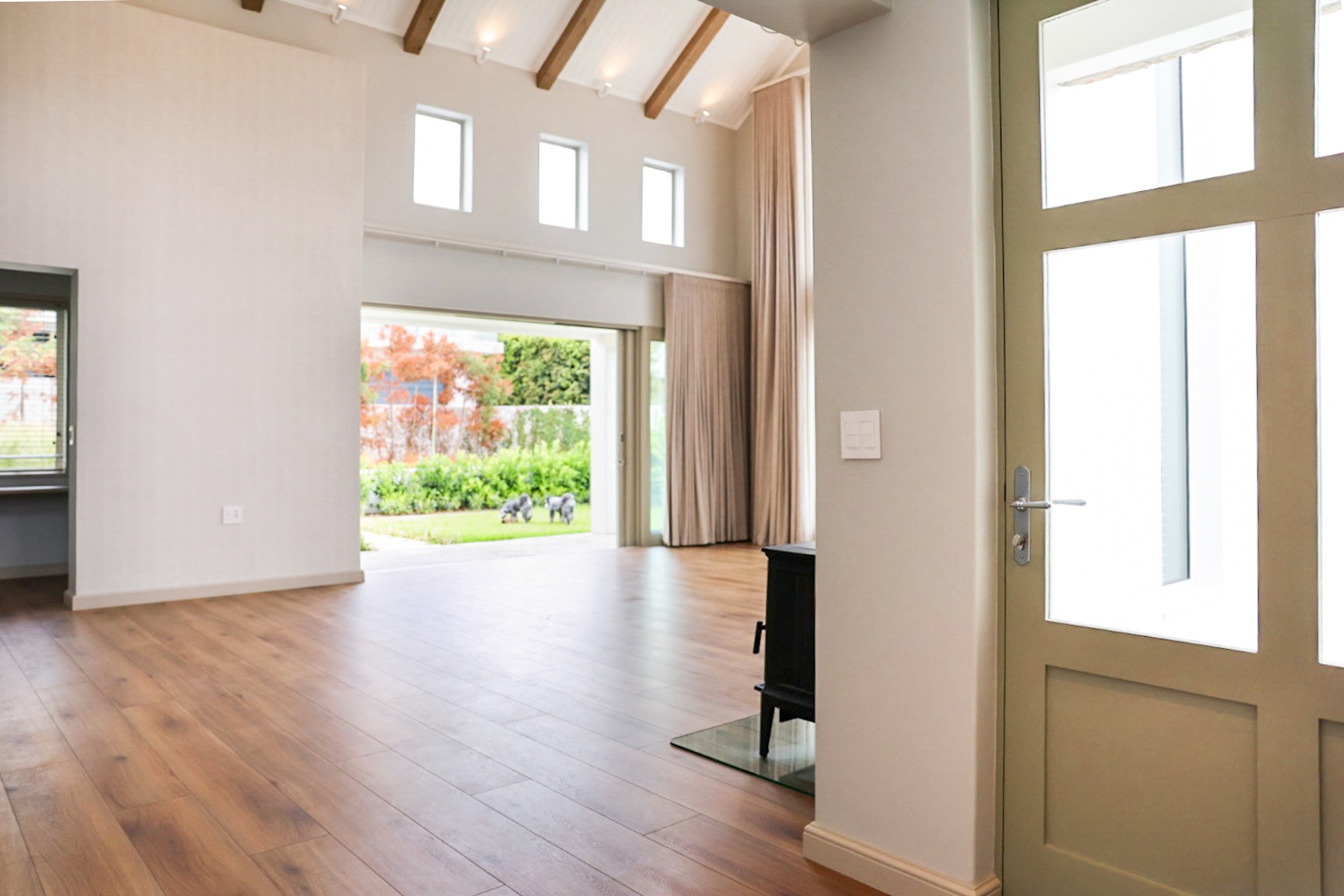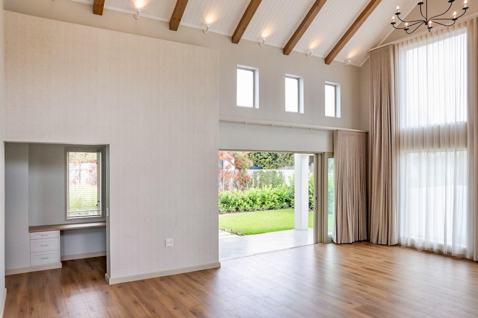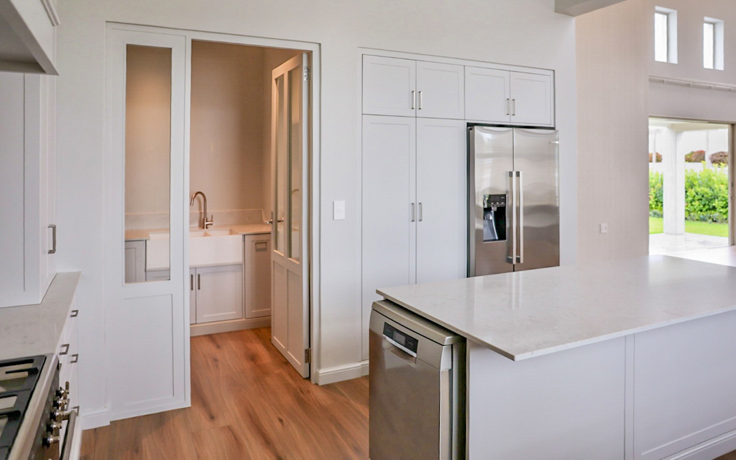 The main house offers two generous en-suite bedrooms (one featuring a full bathroom with both a bath and shower, and the other only a shower) — along with extensive built-in wardrobes with drawers, a separate linen cupboard and a dedicated guest toilet. The main kitchen is stylishly finished with Caesarstone countertops, ample cabinetry and under-counter space for a dishwasher. Included is a double-door fridge/freezer which is, together with the butler sink, fitted with a tri-osmosis water filter system. A separate scullery provides concealed space for a washing machine and tumble dryer and boasts a beautiful double butler sink. The living area impresses with a striking cathedral ceiling, wood-burning combustion fireplace and flows effortlessly onto a north-facing veranda with a gas braai. A built-in study nook with shelving and cupboards, positioned by a window that overlooks the garden, offers a peaceful workspace. Subtle wallpaper accents, air-conditioning in every space, high-quality laminate flooring, block-out and sheer curtains (some motorised), blinds, dimmer switches and carefully selected light fittings accentuate the home’s timeless charm and comfort.