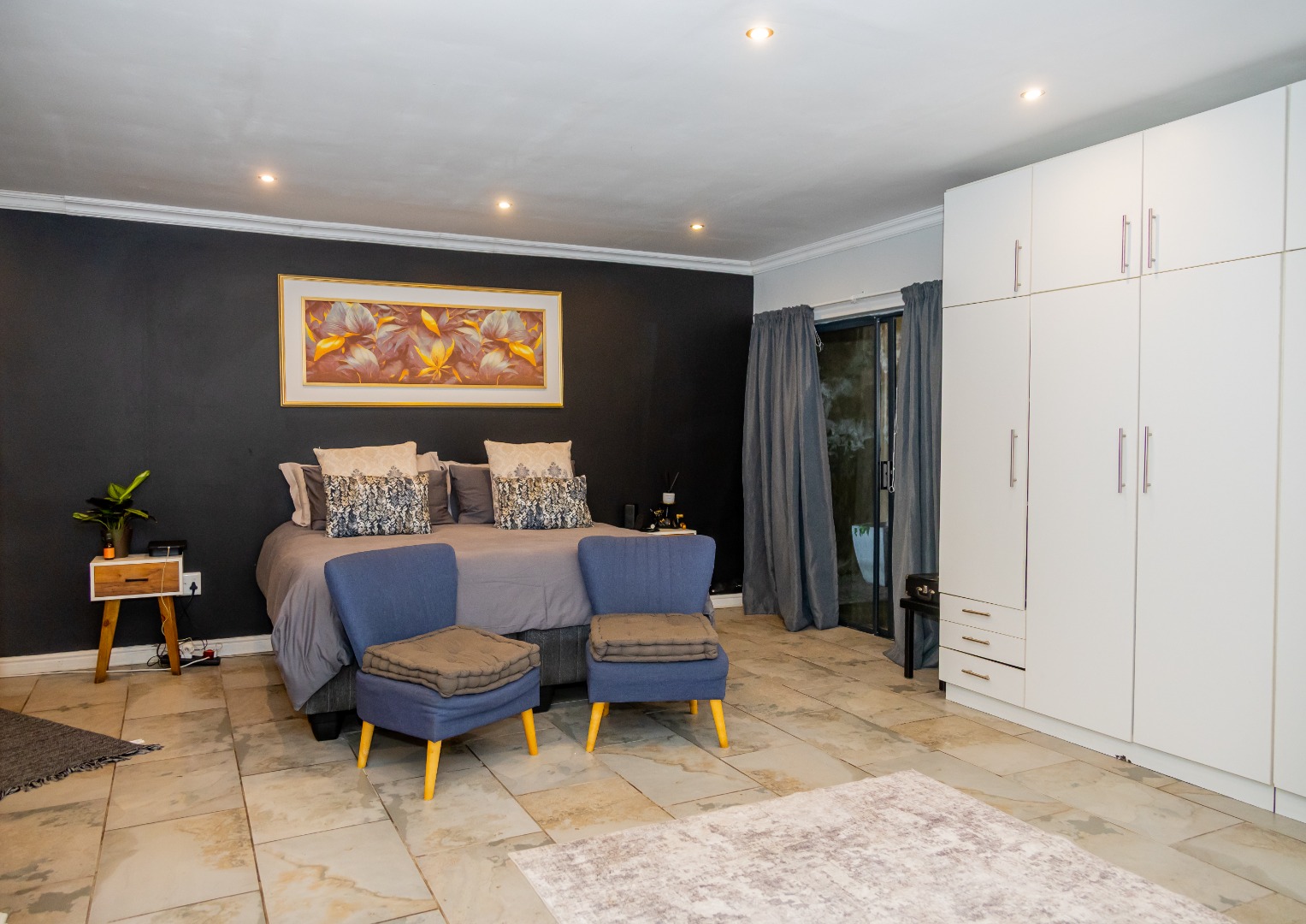Downstairs, the impressive main bedroom has ample space. It also has an en-suite bathroom.