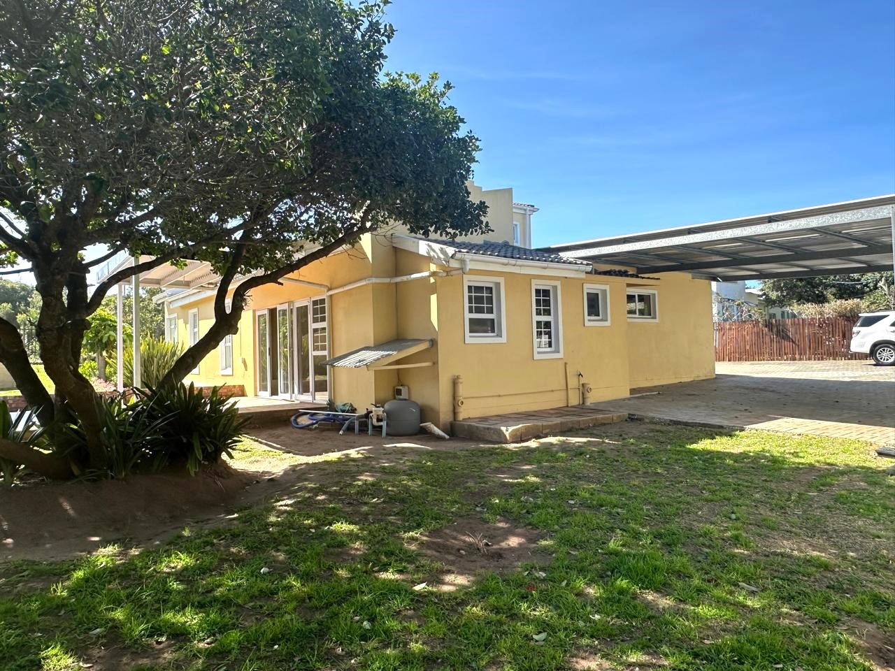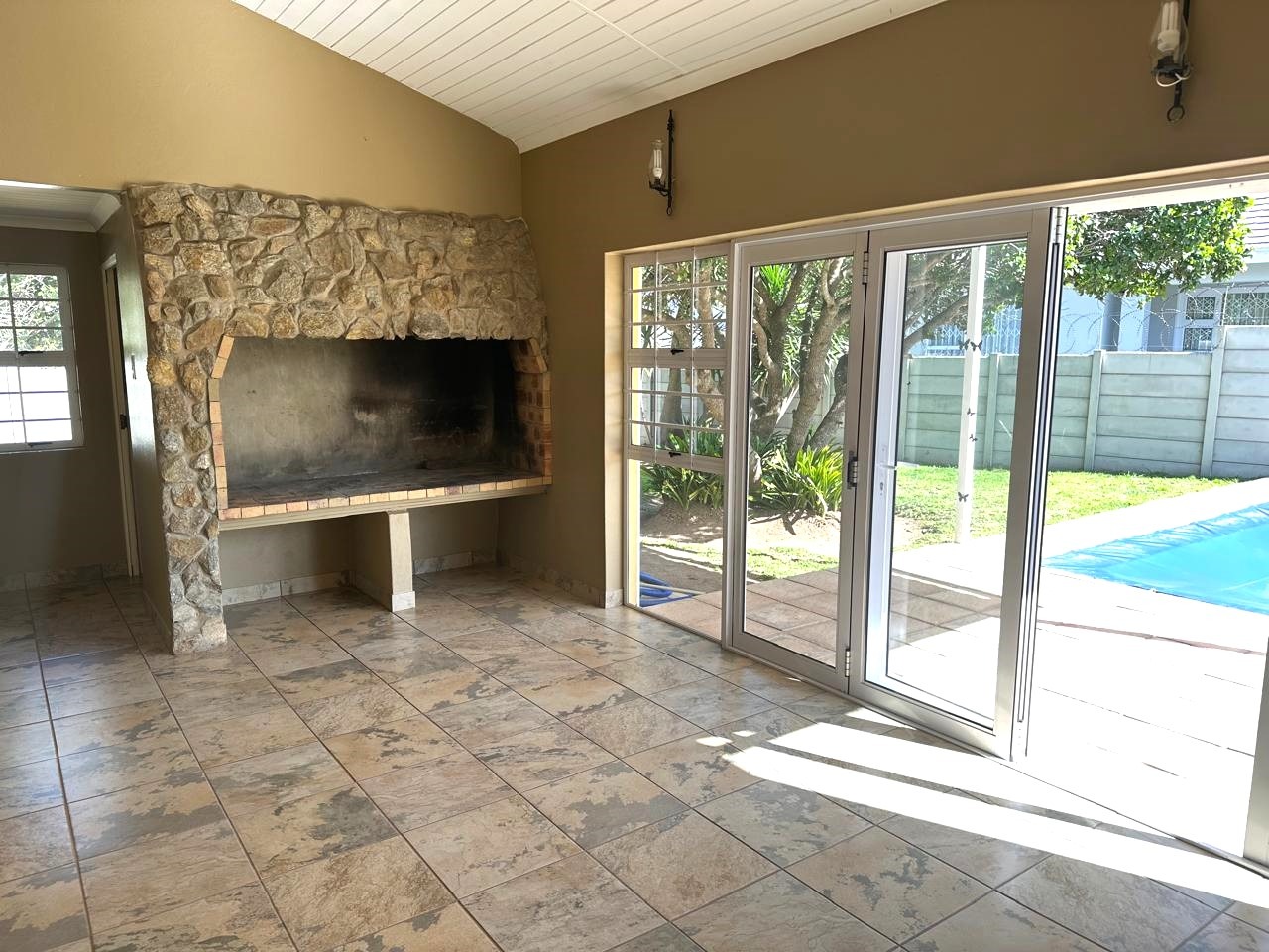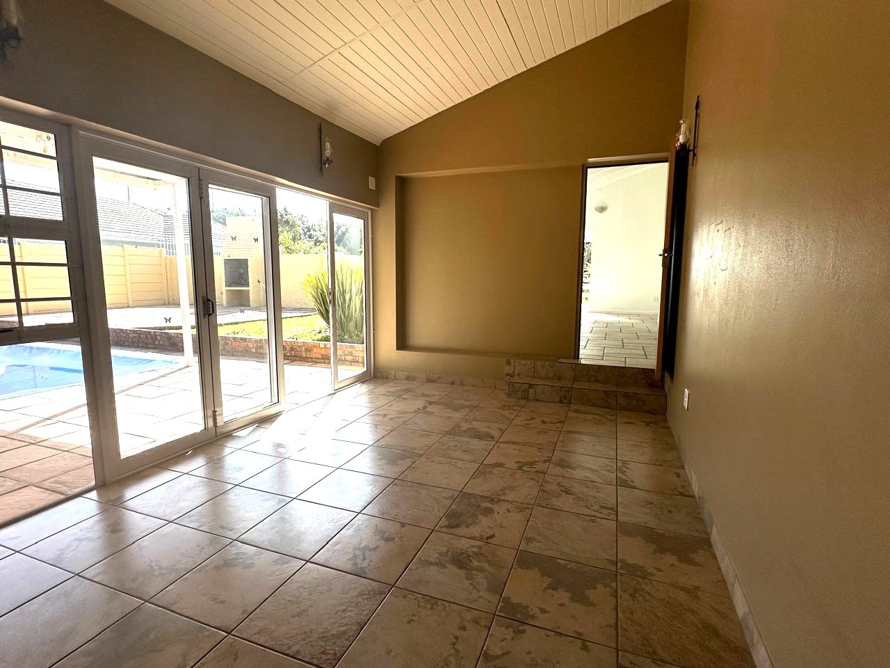 The braai room, complete with a built-in braai, opens onto a patio and swimming pool area, making it an ideal setting for outdoor entertaining and enjoying sunny days. A guest toilet adjacent to the braai area and swimming pool ensures comfort for guests. Additional amenities include a double garage and double carport, providing ample parking and storage space for a caravan, boat, or camper vehicle, catering perfectly to those who cherish outdoor activities.