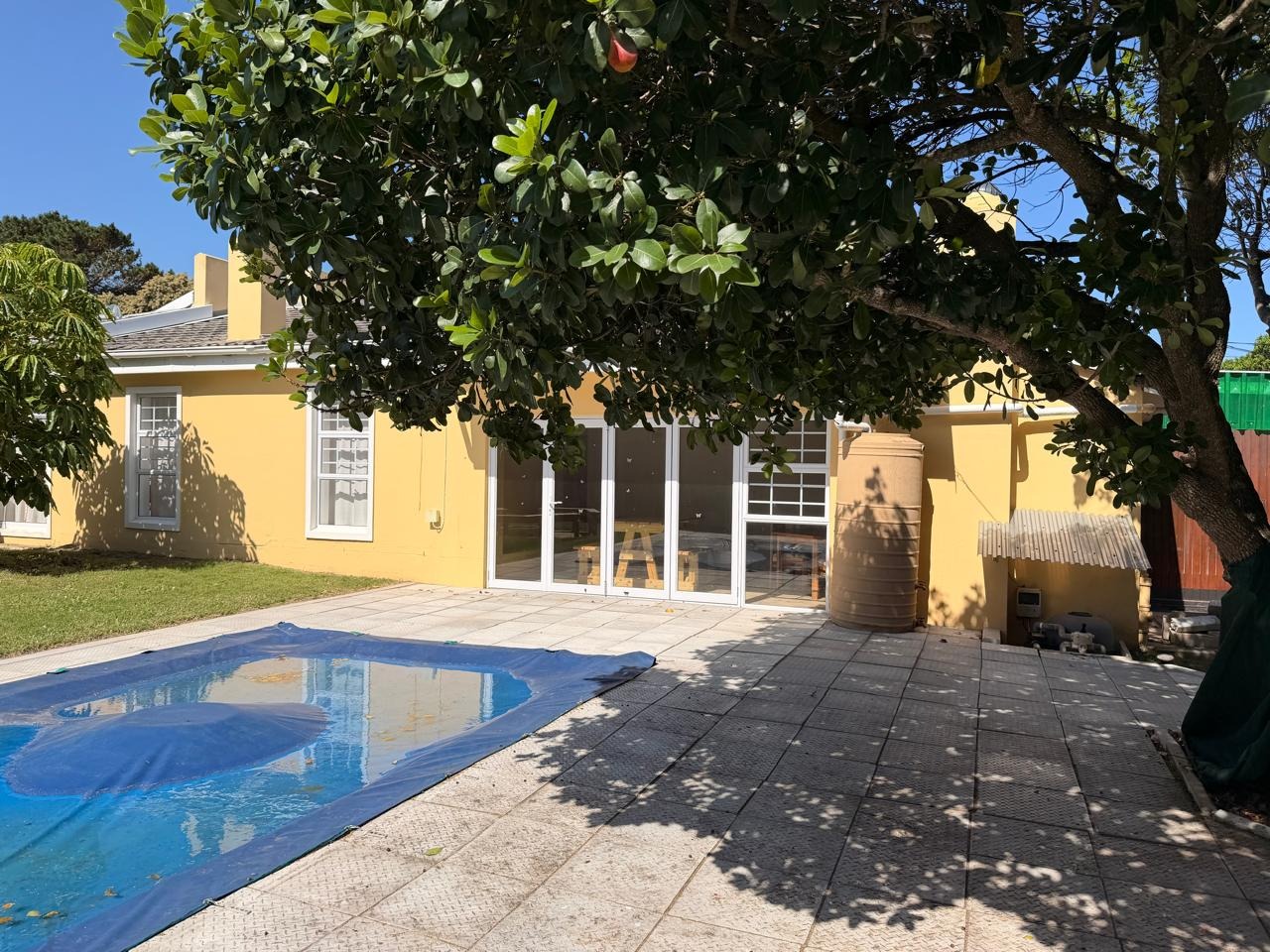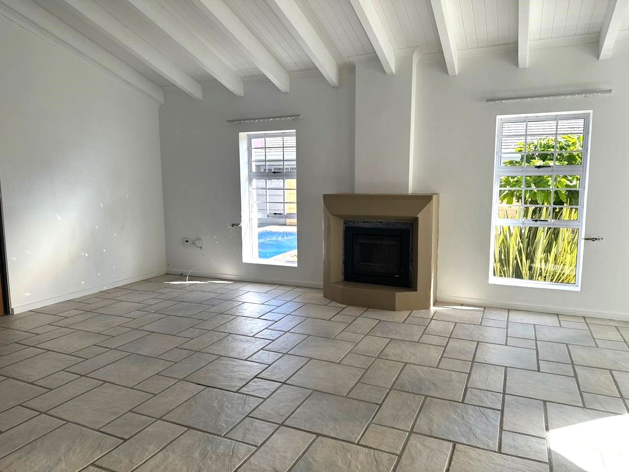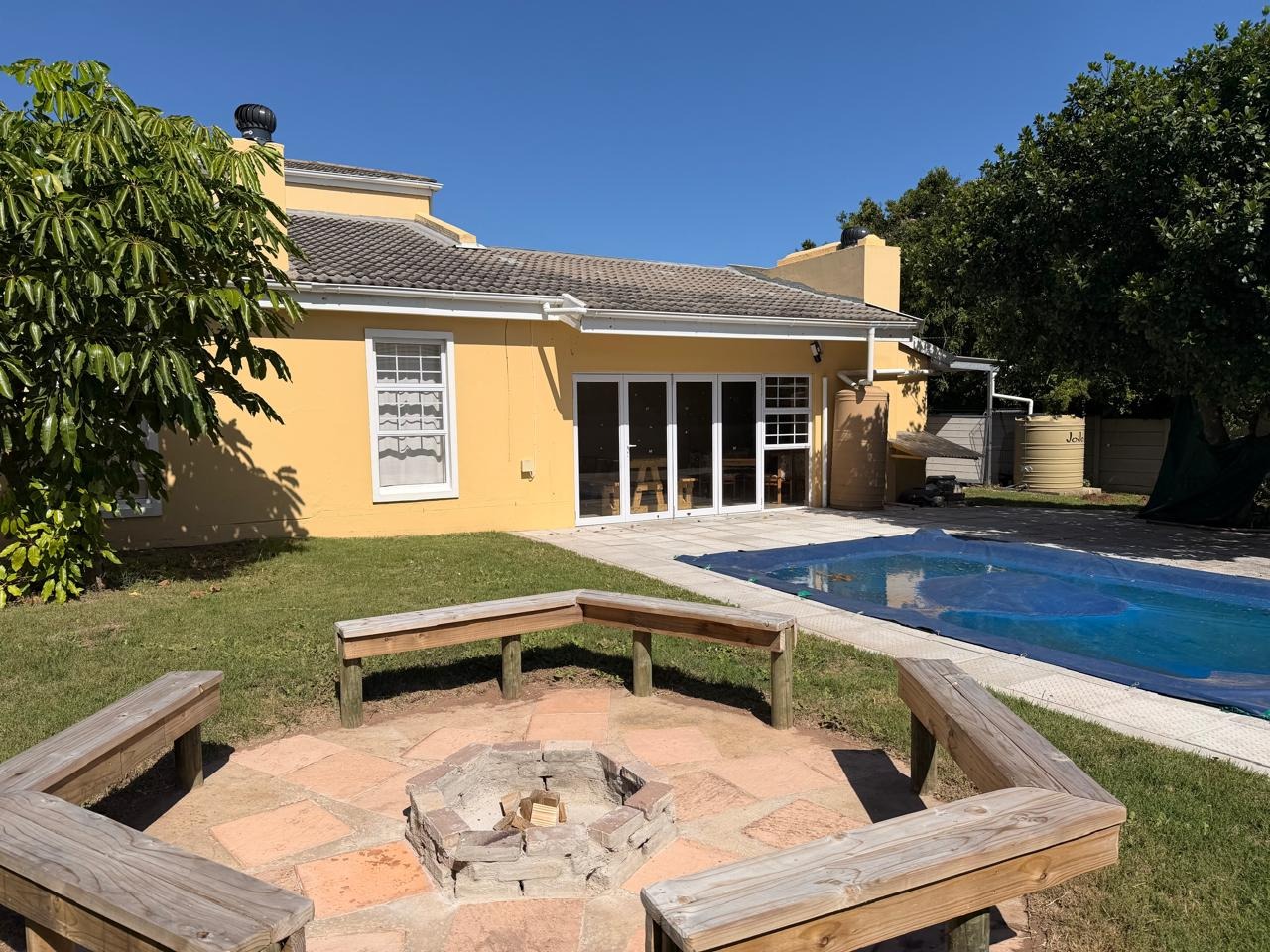 The braai room, complete with a built-in braai, opens onto a patio and swimming pool area, making it an ideal setting for outdoor entertaining and enjoying sunny days. A guest toilet adjacent to the braai area and swimming pool ensures comfort for guests. Additional amenities include a double garage and double carport, providing ample parking and storage space for a caravan, boat, or camper vehicle, catering perfectly to those who cherish outdoor activities.