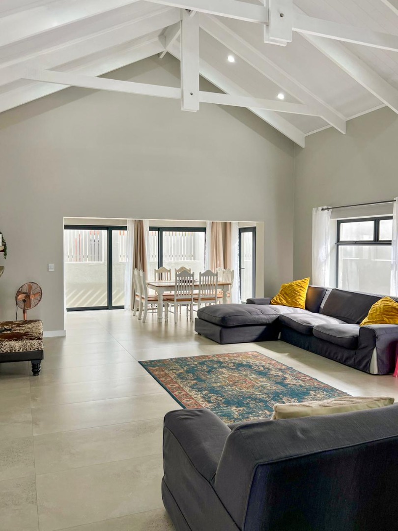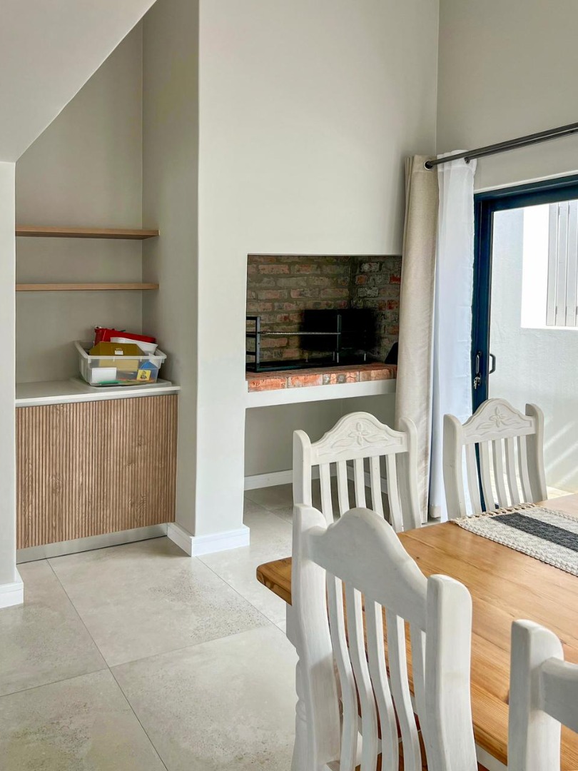 The open-plan living area is designed with both comfort and entertaining in mind. A stylish modern kitchen flows seamlessly into a spacious lounge and dining area, complete with an indoor braai—perfect for year-round gatherings. Sliding doors lead effortlessly to the outdoors, creating a natural indoor-outdoor flow ideal for relaxed family living.
